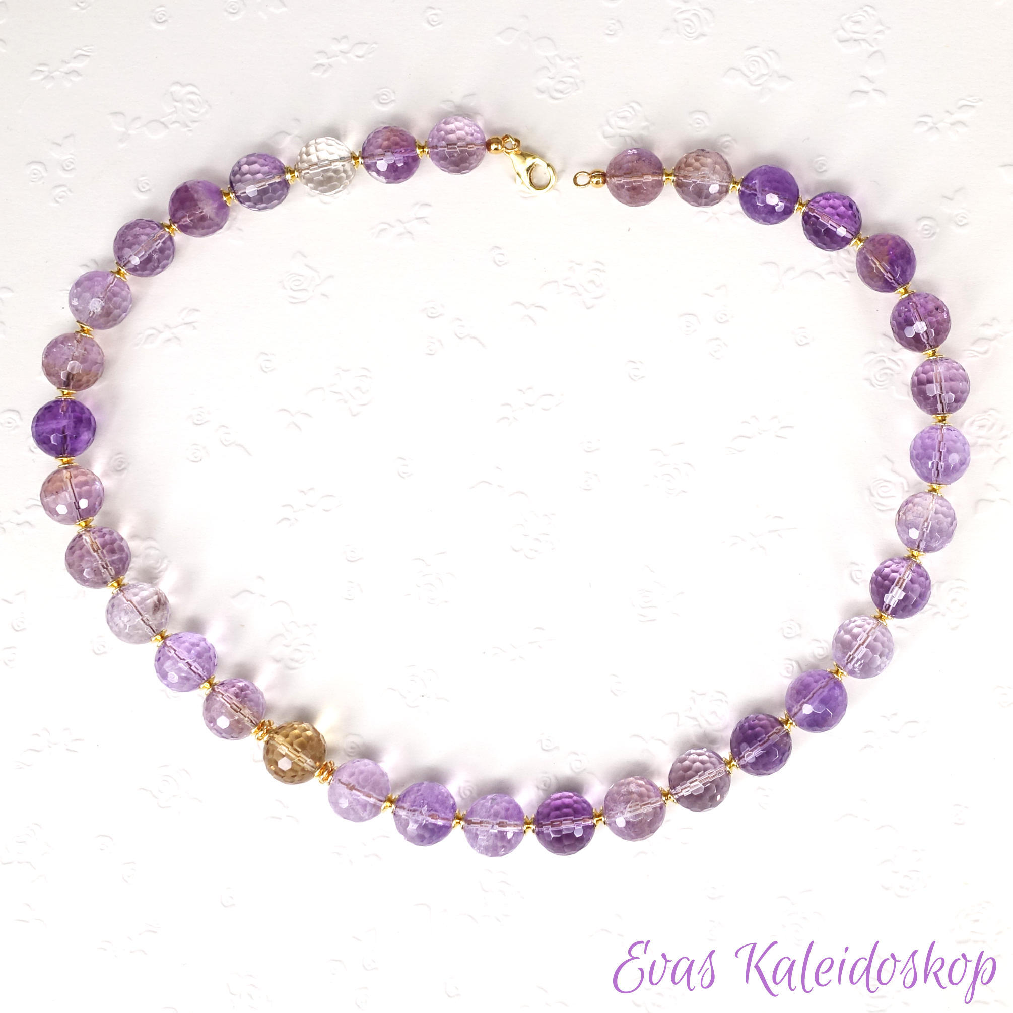 In unzähligen Facetten strahlt die klare Ametrin Kugelkette. Ametrin ist eine seltene Kombination aus violettem Amethyst und gelbem Citrin in einem Stein vereint. Um die gelben Anteile zu unterstützen, habe ich zwischen alle Steine vergoldete Spitzlinsen gesetzt. Einen gelben Stein leicht asymmetrisch der Mitte habe ich noch einmal extra betont. Verschlossen wird die Kette mit einem vergoldeten Karabiner. Die Öse des Gegenstückes ist klein, aber dennoch gut zu verschließen, da sie feststeht. Auf Wunsch kann ich jedoch einen extra Ring am Verschluss anbringen.