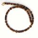 Das Tigerauge besticht durch den Katzenaugeneffekt mit seidigem Glanz und ändert sich bei jeder Bewegung. Zwischen die Scheiben habe ich etwas größere Kugeln eingefügt, dazwischen blitzen golden eloxierte Hämatine.