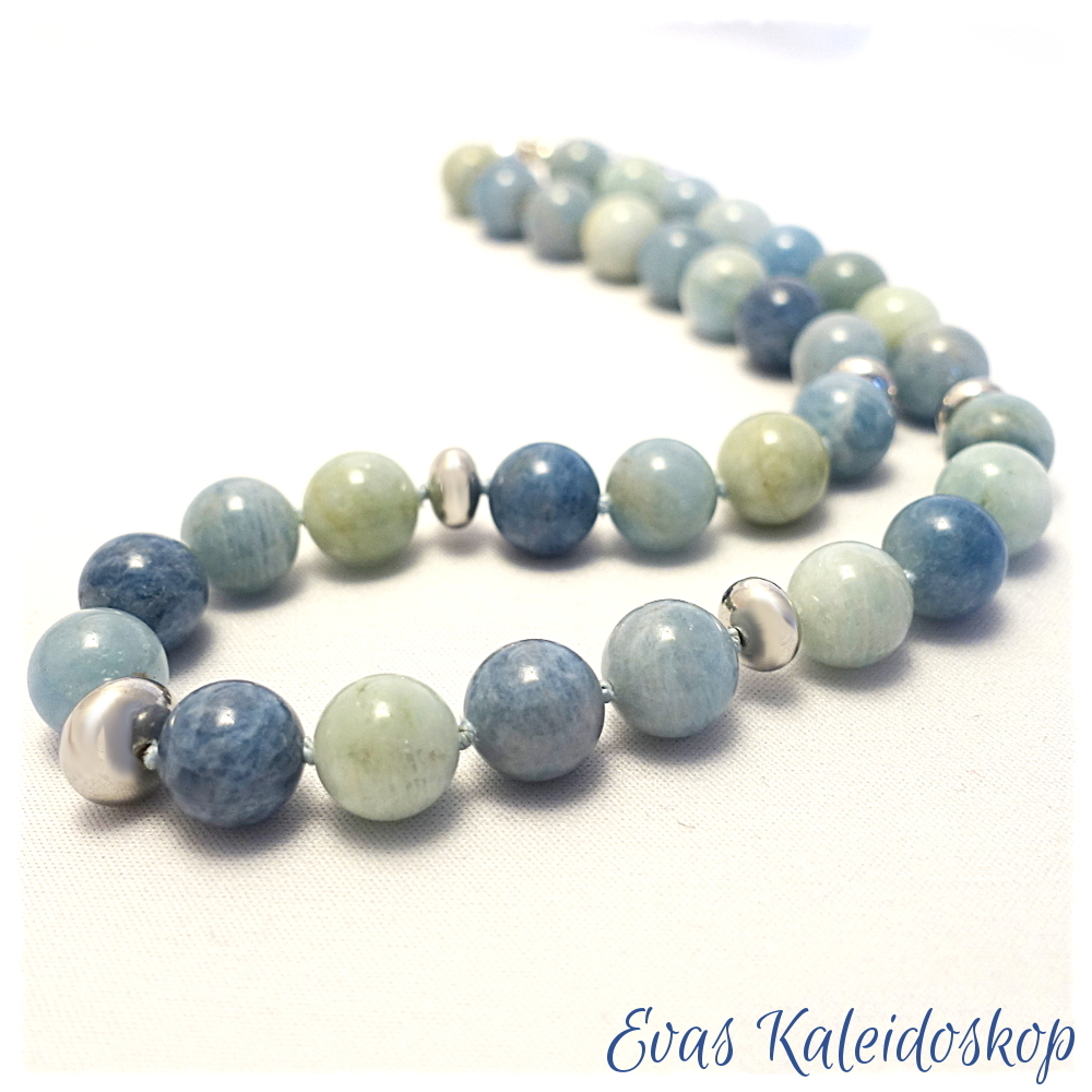 Manche Ketten muss ich unbedingt knoten, diese gehört dazu. So kommen die einzelnen Steine wunderbar zur Geltung. Die Aquamarine sind opak und haben viele unterschiedliche Blau-/Türkistöne. Große Linsen aus echtem Sterling Silber setzen glänzende Akzente.Die Magnetkugel aus Silber ist sehr stark und man sollte sie nur durch gegeneinander verschieben öffnen. So wird die Seide nicht überstrapaziert.