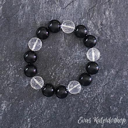 14 mm große Onyx und Bergkristall Kugeln reihen sich zu einem üppigen Armband. Von der Größe her auffallend, aber farblich sehr dezent.