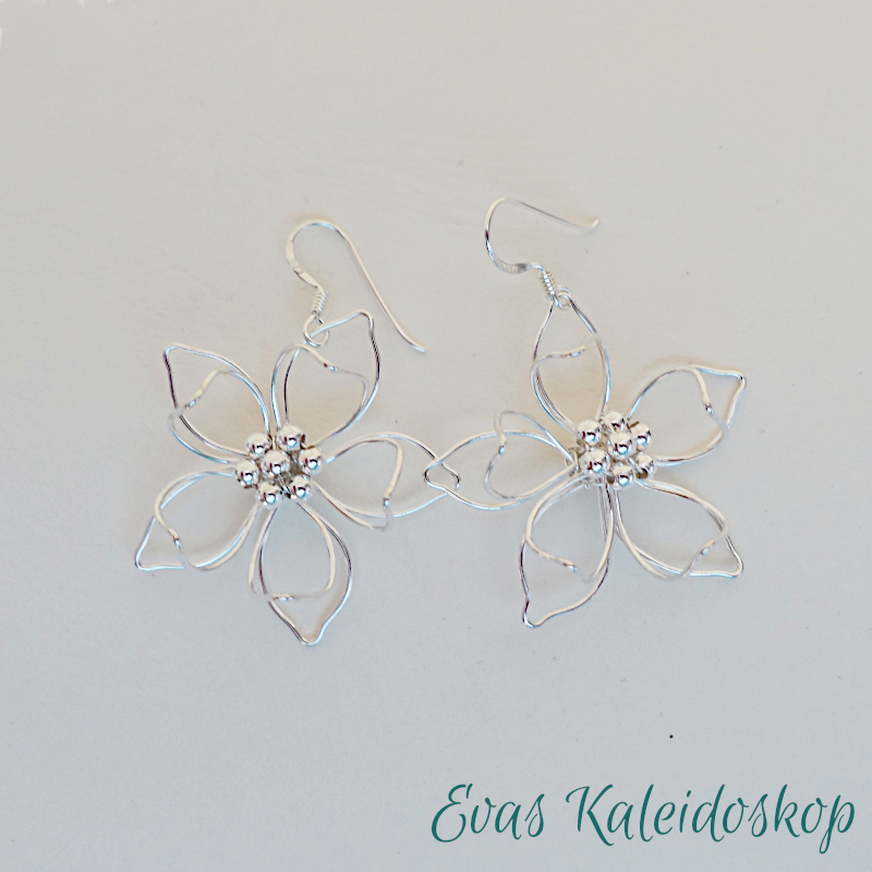 In der Mitte der großen Silberblüten sind 7 Silberkugeln als Staubgefäße. Der Blütenkelch hat zwei Reihen von nach innen gewölbten Blütenblättern. Durch Silberdraht sind die einzelnen Komponenten fest miteinander verbunden.