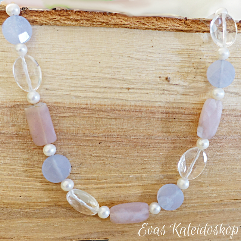 Rosa und hellblauer Chalcedon, Kette mit Bergkristall und Perle