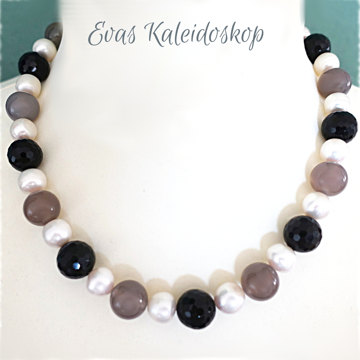 Kette aus schwarzem, facettiertem Onyx, grauem Achat und schimmernder Perle